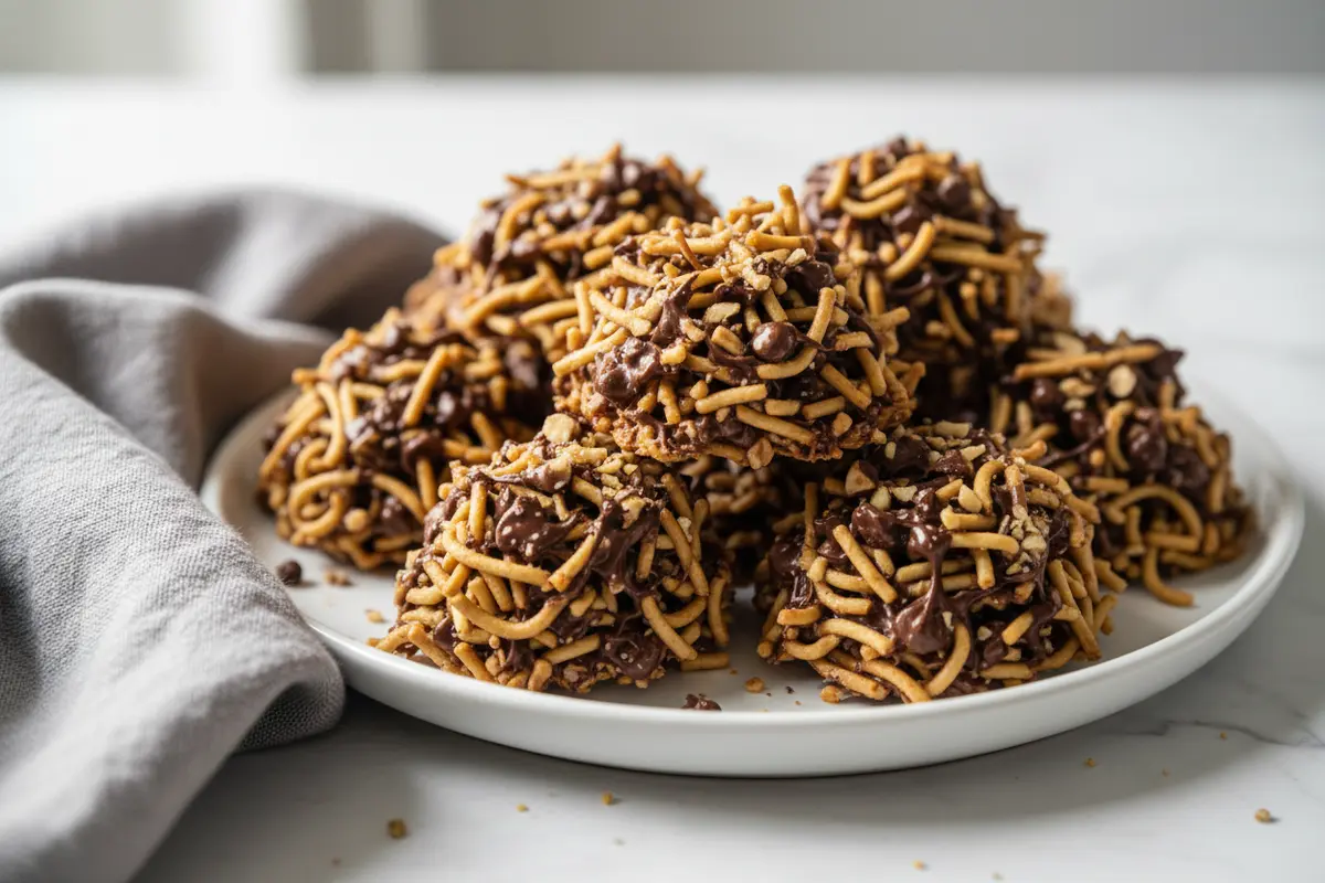 These easy no-bake chocolate oatmeal cookies deliver a satisfying contrast of creamy melted chocolate, crunchy chow mein noodles, and toasted nuts—all set and ready to eat in under 30 minutes. No mixing bowls, no baking sheets in the oven, just melt, fold, drop, and chill.